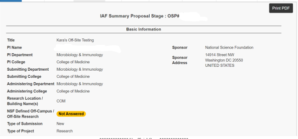 As of 8/21/2023, IAFs where the sponsor or prime sponsor is National Science Foundation hierarchy, the Basic Information section will display the NSF Defined Off-Campus/Off-Site Research question and answer. It will display as "Yes" or "No". The question is answered by the primary PI on the IAF Investigators Tab.
