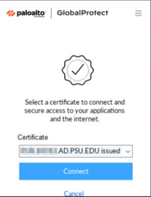 PSU owned and managed computers that have an EAD Computer Certificate installed may see a prompt to select a certificate when connecting to the GlobalProtect VPN.